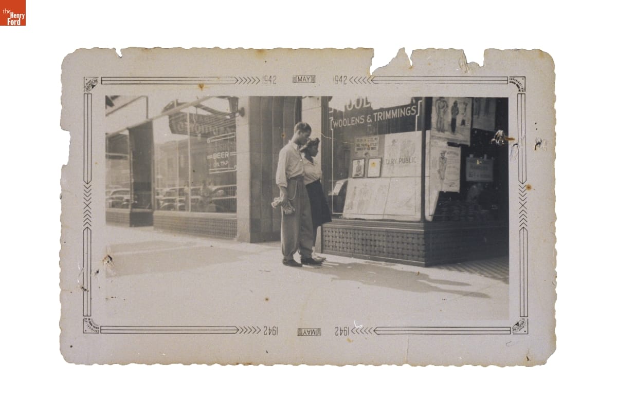 A Man and Woman Looking at the Display Window at Fox Brothers Clothier, Chicago, Illinois, May 1942