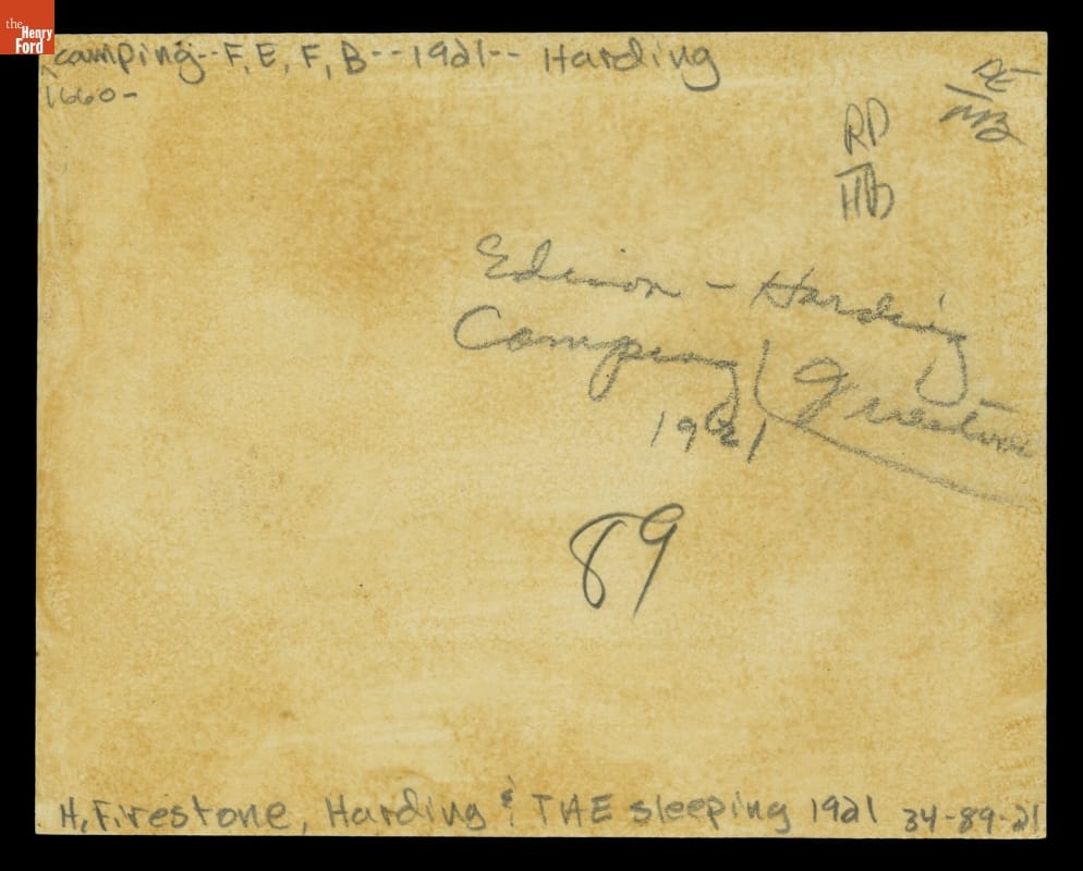 Harvey Firestone, Thomas Edison, and Warren G. Harding at the "Vagabond" Campsite, 1921
