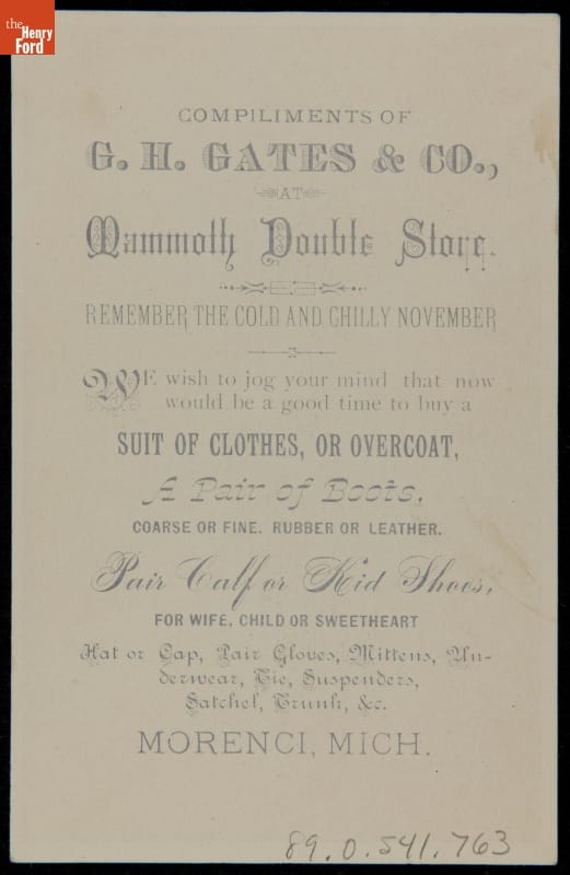 Trade Card for G.H. Gates & Co., "Remember the Cold and Chilly November" 1873-1885