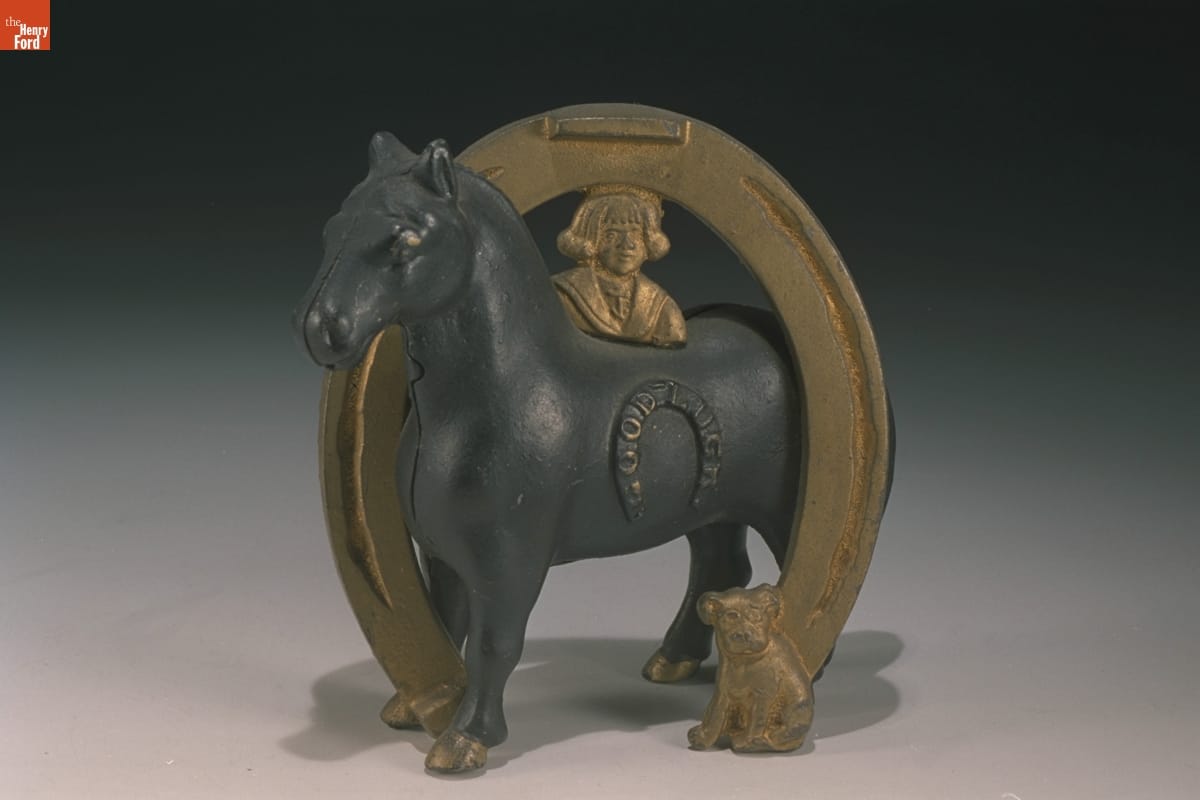 Still banks provide a simple way to save money. You place your coin in the slot then let it drop -- there are no mechanical devices. Still banks came in a variety of interesting and decorative shapes. Along with a horse and "Good Luck" horseshoe, this bank depicts Buster Brown and Tige -- popular comic characters in the early 20th century.