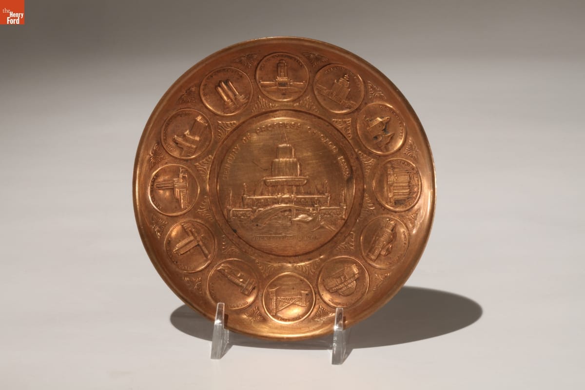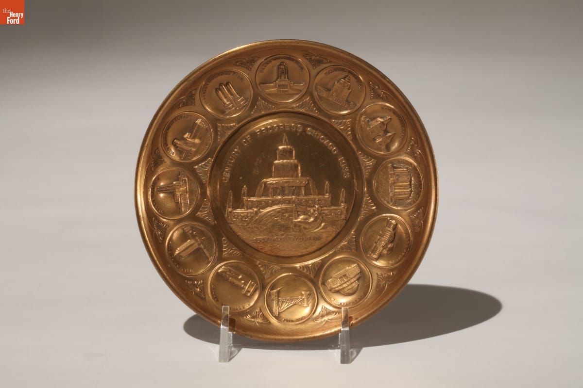 Chicago's 1933-34 Century of Progress Exposition used the theme of progress to buoy national optimism during the darkest years of the Great Depression. Many fairgoers returned home with mementos, such as these ashtrays depicting landmarks from the exposition.