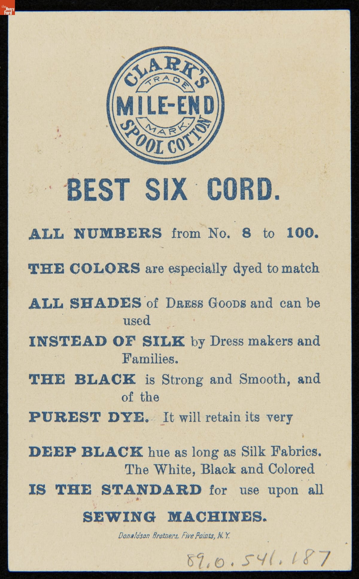 Products manufactured by Clark's O.N.T., Newark, New Jersey. Card printed by Donaldson Brothers, Five Points, New York.