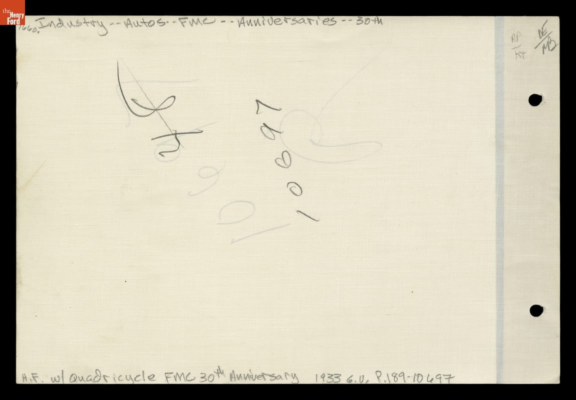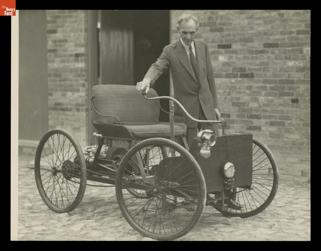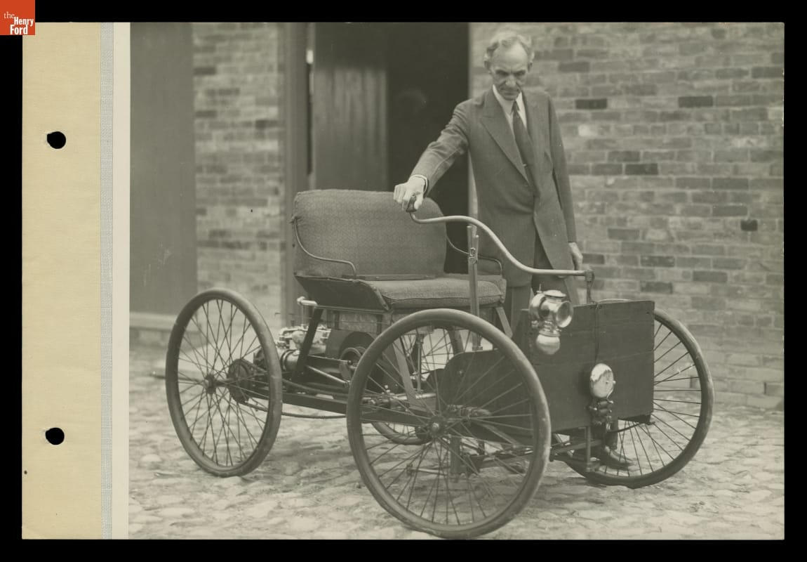 Henry Ford built his first automobile, the Quadricycle, at his Bagley Avenue Workshop in 1896. This photograph shows Ford and his Quadricycle in front of a recreated workshop at Greenfield Village -- Ford's historical outdoor museum -- in Dearborn, Michigan. The image commemorates the 30th anniversary of Ford Motor Company in 1933.