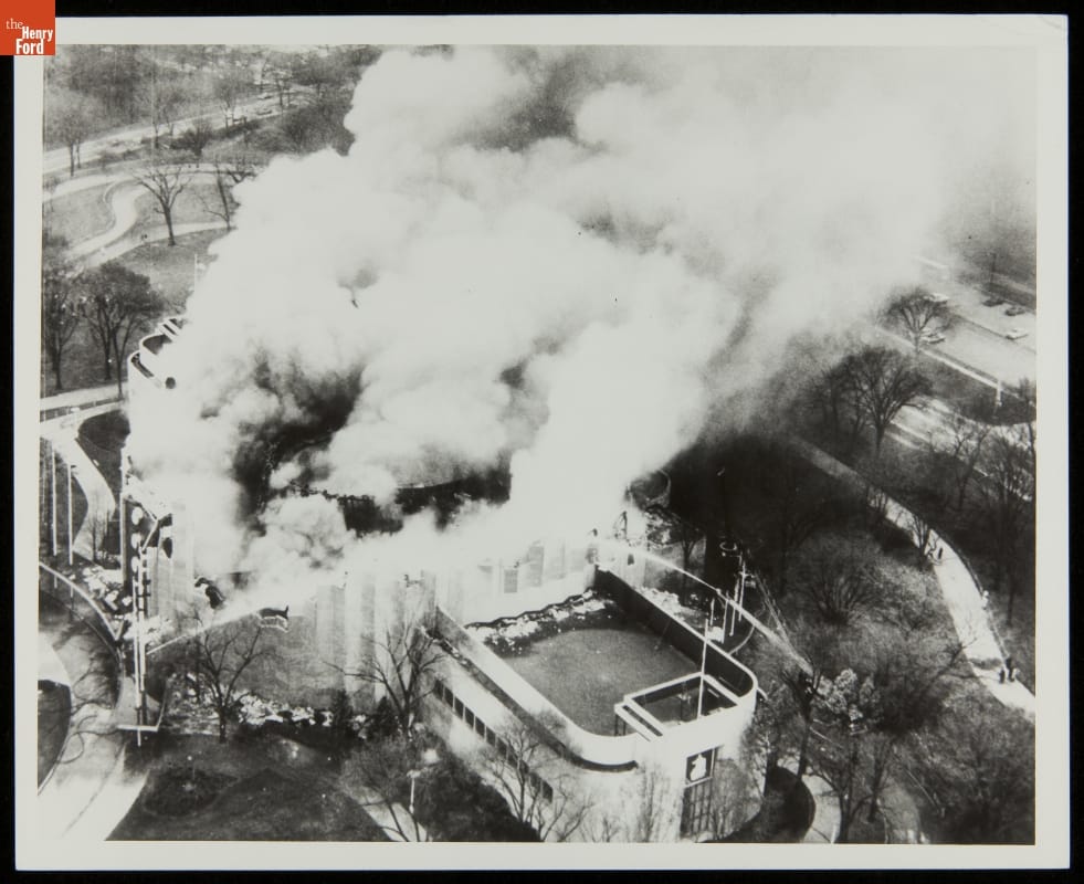 Ford Motor Company brought its central Rotunda building from the 1934 Century of Progress Exposition back to Dearborn and, from 1936 to 1962, recreated the excitement of a World's Fair exposition on its home turf. This photo vividly depicts the Ford Rotunda fire, November 9, 1962, caused when a sealer for the geodesic dome ignited accidentally from a propane heater.