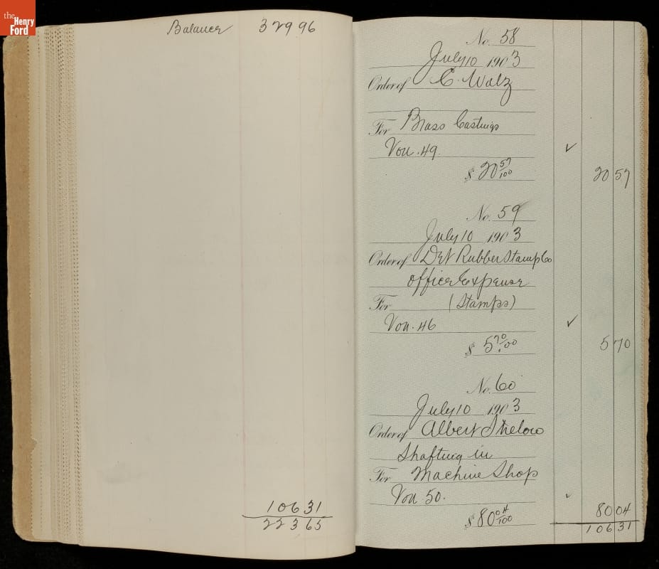 In 1899 Henry Ford left the only steady job he had ever had as chief engineer of the Edison Electric Illuminating Company in Detroit to start an automobile company. By 1903 that first company had failed, and he had quit a second company in a dispute with his financial backers. Despite all the evidence to the contrary, Ford convinced a new group of investors that there was money to be made manufacturing automobiles designed by Henry Ford. On June 16, 1903 those investors filed articles of incorporation for the Ford Motor Company. On June 26 one of the investors [and Secretary of the Board of Directors], James Couzens, began keeping the checkbook.