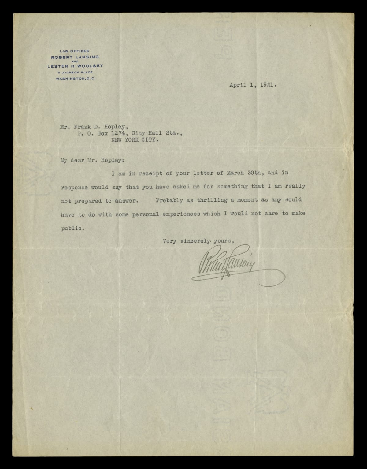 Letter from Robert Lansing to Frank Hopley, April 1, 1921, "The Most Thrilling Moment of My Life"
