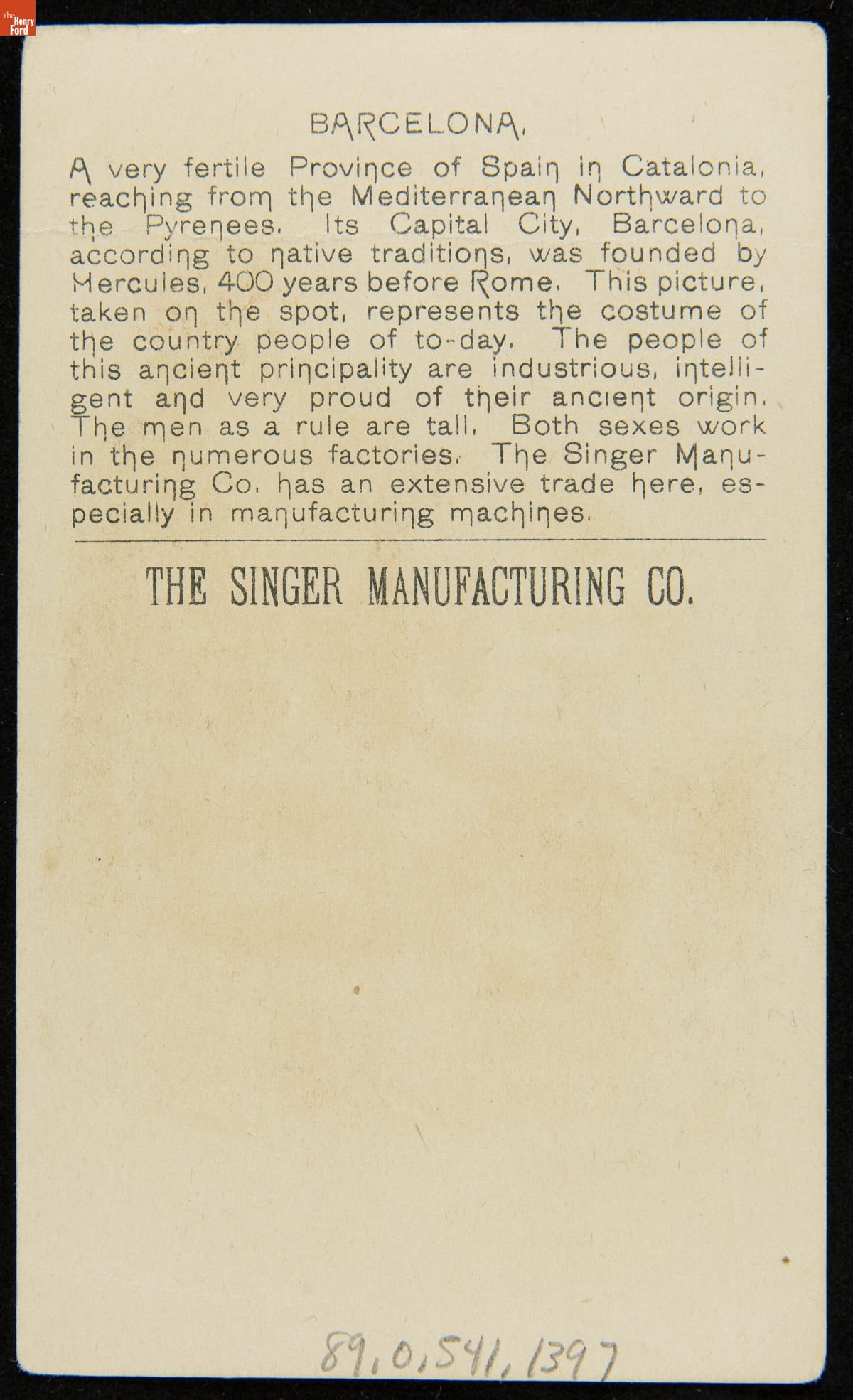 As color printing gained momentum in the late 19th century, trade cards became a major means of advertising goods and services. Americans enjoyed and often saved the vibrant little advertisements found in product packages or distributed by local merchants. The Singer Sewing Machine Company had a series of trade cards, like this one, offering images of Singer machine users from around the world in their national dress.
