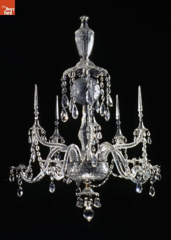 This late 18th century chandelier likely illuminated a grand parlor or dining room in the house of a wealthy individual in one of America's large coastal cities. Imported from England or Ireland, it was intended to impress visitors with the good taste of its owner. The glass column, arms, and crystal pendants would have reflected and refracted candlelight into dark corners.