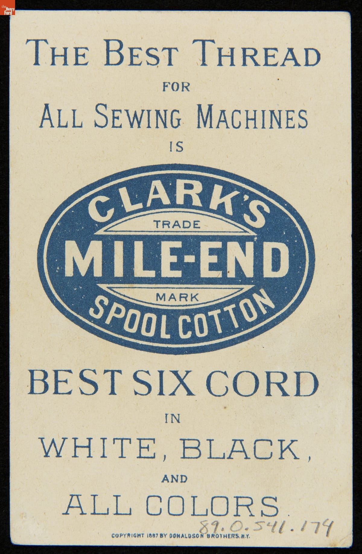 Trade Card for Clark's Mile-End Spool Cotton, Clark's O.N.T., 1887