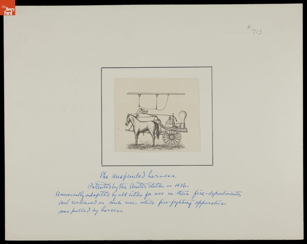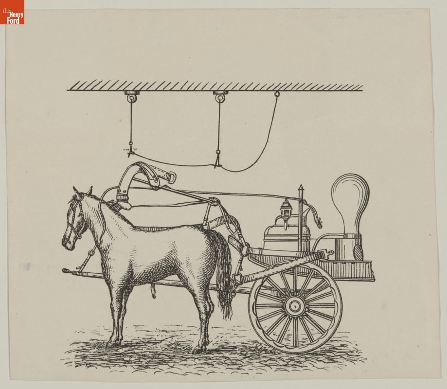 In a fire emergency, every second counts. During the 19th century, when fire engines were pulled by horses, fire departments and manufacturers of firefighting gear developed systems to harness horses to equipment as quickly as possible. This illustration shows a harness suspended from the ceiling, where it could be lowered onto a horse swiftly when needed.