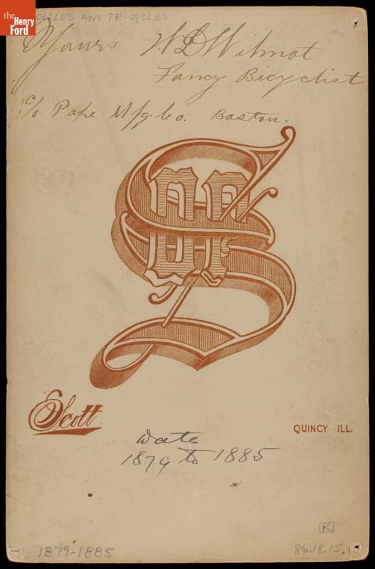 Handwritten on back: Yours W.D. Wilmot / Fancy Bicyclist / c/o Pope Mfg. Co. Boston / Date / 1879 to 1885