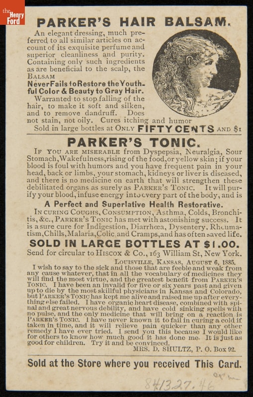 Trade Card for Hiscox & Co., "Parker's Tonic Brings the Bloom of Health," circa 1900