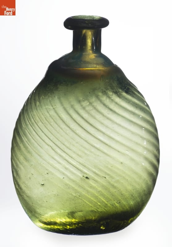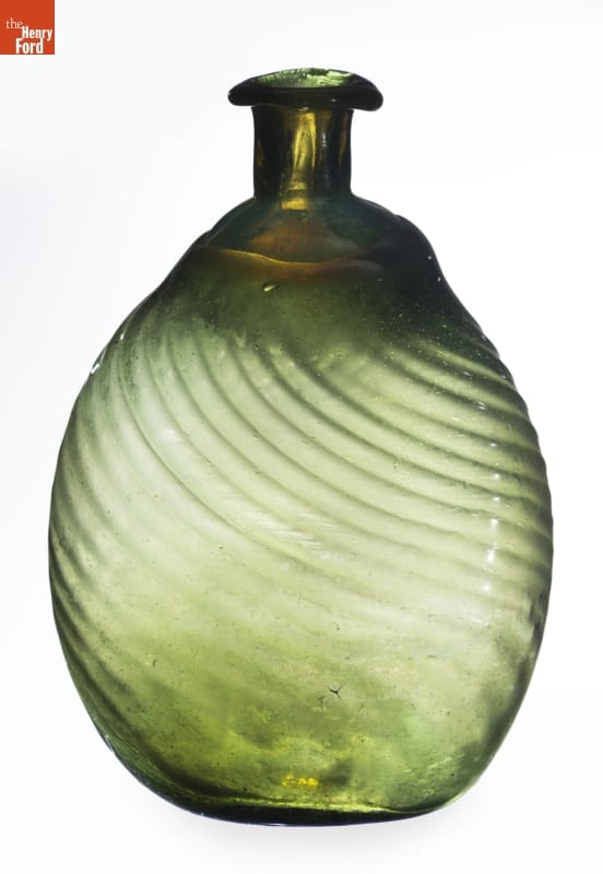 American glass factories produced flasks, like this one, from the late 1700s well into the mid-1800s. The pint-sized flask could hold water but more likely contained alcoholic beverages. Its textured decorative exterior -- formed when the hot glass was dipped into a pattern mold before it was blown -- made the flask easier to grasp. And its flattened shape fit nicely into pockets providing ready access to the liquid refreshment.