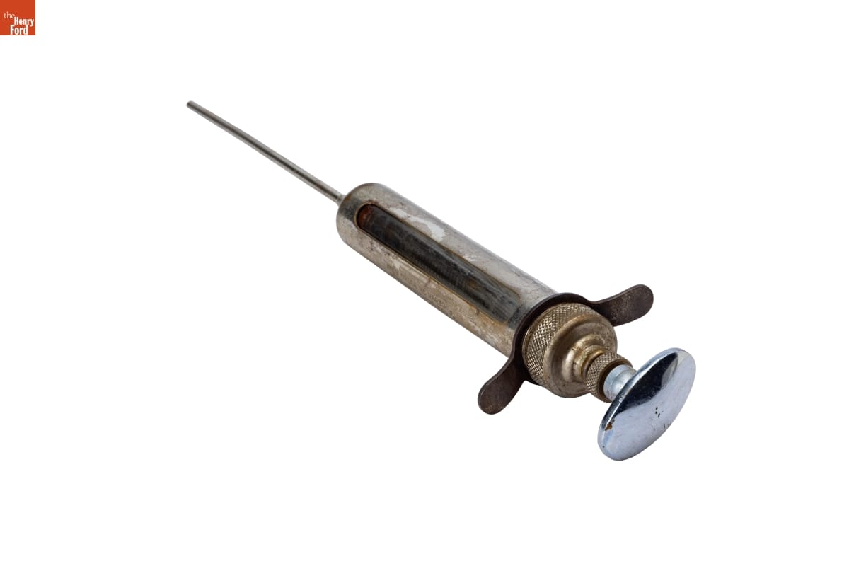 Veterinarians use dose syringes to dispense a specific quantity of medicine. This syringe injects medicine orally into an animal's mouth -- unlike syringes that use a needle to inject medicine intravenously into the bloodstream. Dose syringes like this one, made of metal, were not disposable and had to be sterilized between uses.