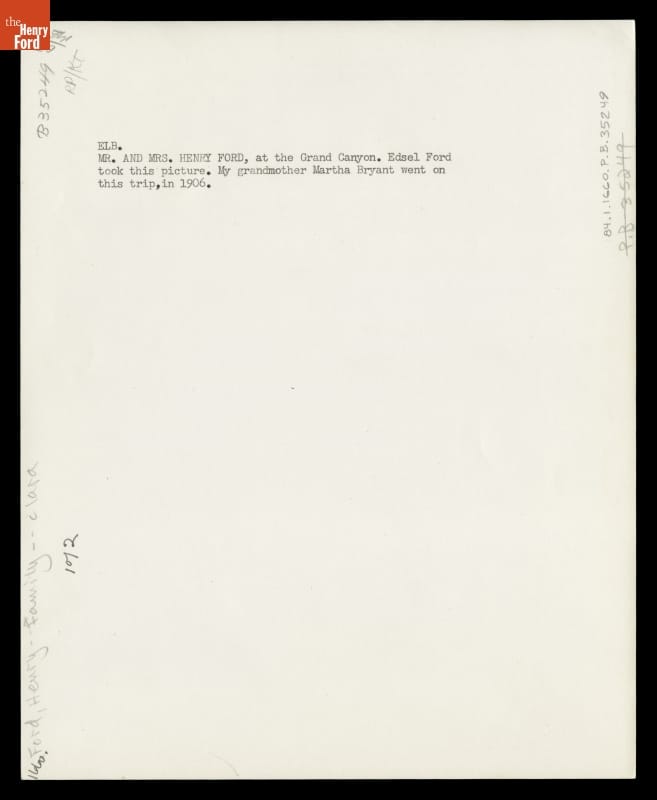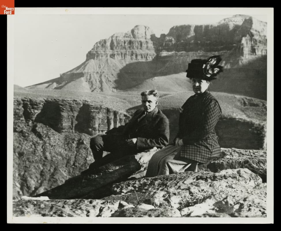 Henry and Clara Ford pose at the Grand Canyon during a 1906 vacation. Also along on this trip were the couple's son, Edsel, and Clara's mother, Martha Bryant. The group was traveling to Pasadena, California, where Clara's sister Eva was living, and then to Seattle, Washington, to visit her brother Harry.