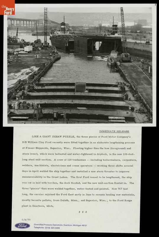 In 1979, Ford Motor Company's ore carrier William Clay Ford traveled to Fraser Shipyards in Superior, Wisconsin, to have its hull lengthened. As built in 1953, the vessel measured 647 feet long. The 1979 modifications added 120 feet, increasing the William Clay Ford's total length to 767 feet.
