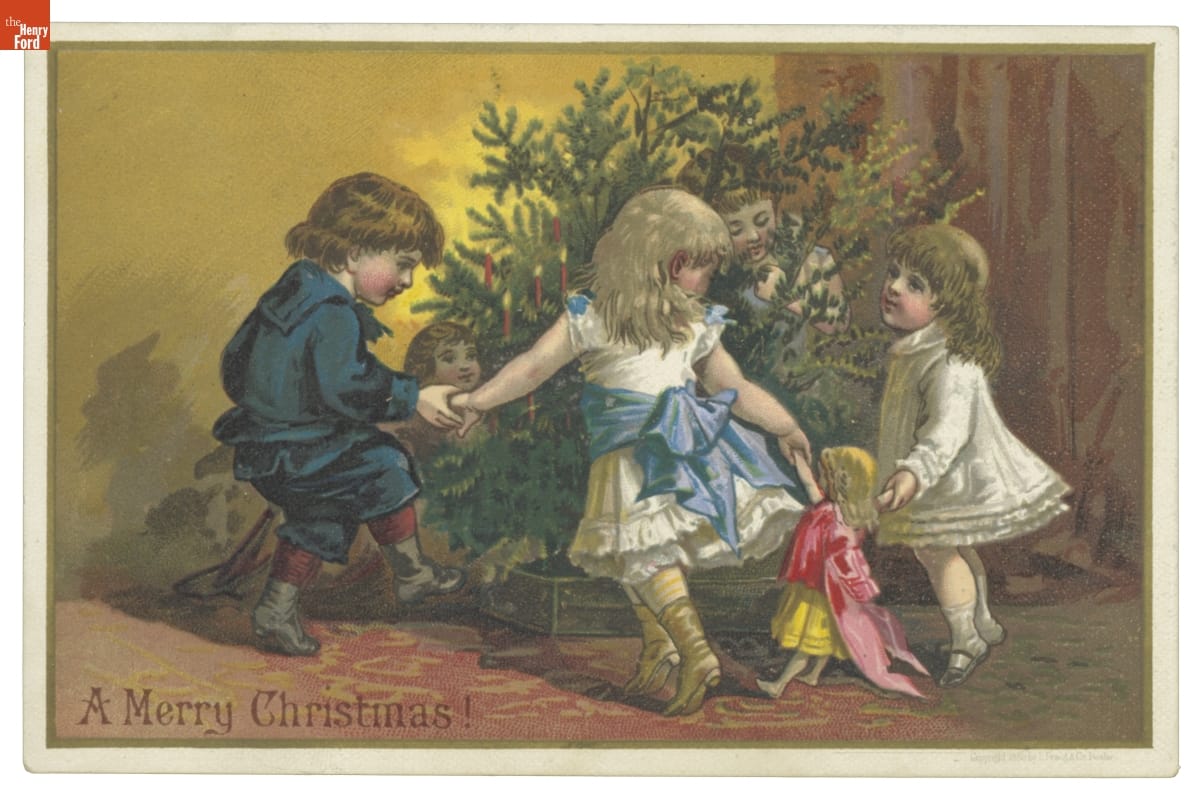 When commercially designed greeting cards were introduced in the second half of the 19th-century, Americans began mailing holiday cards wishing friends, family, or neighbors a merry Christmas. This early example - intended to capture the youthful delight of the season - illustrates period Christmastime decorations and traditions.