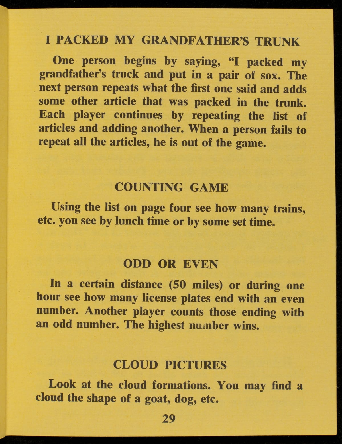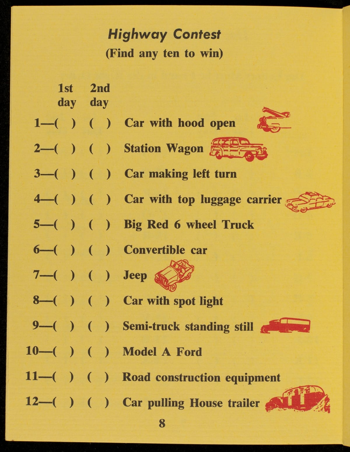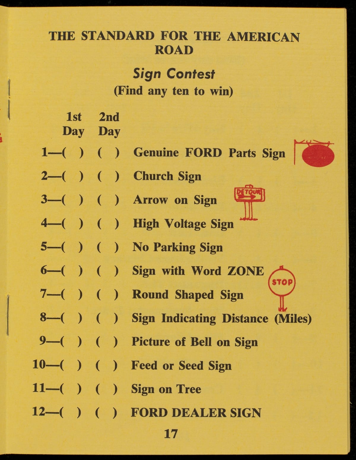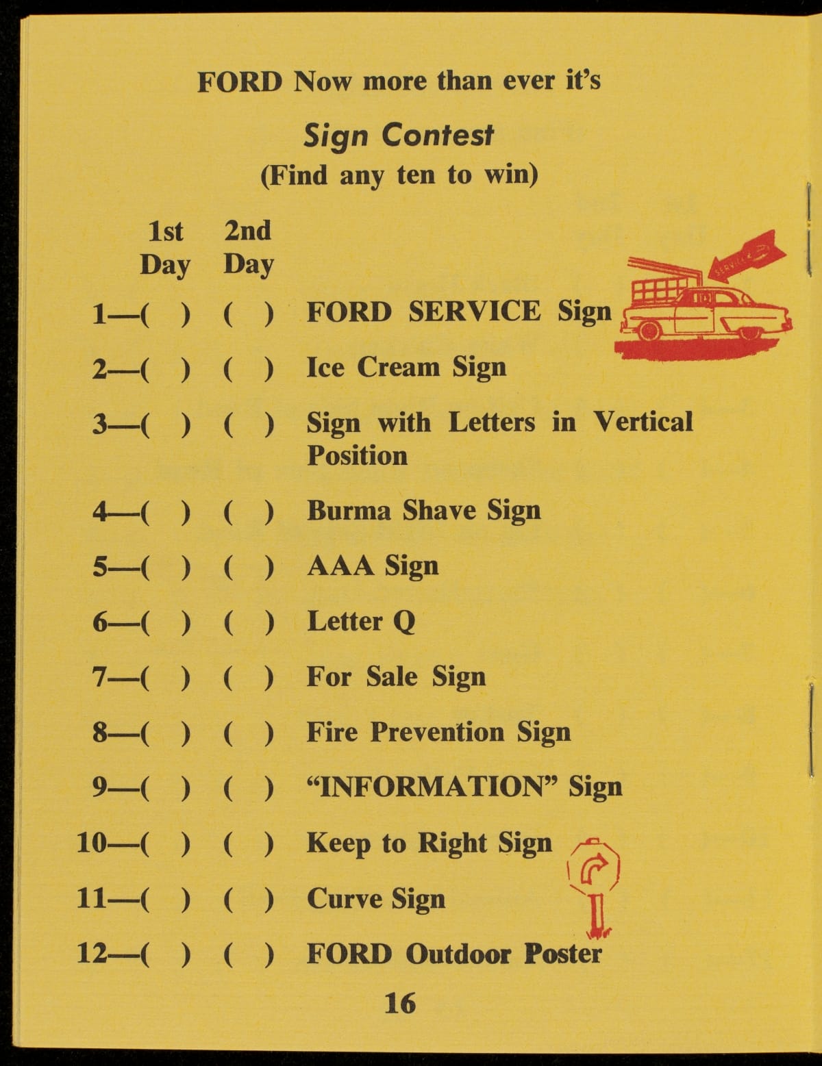 This giveaway from Ford dealers allowed parents and children to play games while traveling. Players were required to observe license plates, road signs, animals, and other vehicles. Some games of course asked players to look for Ford-related signs or specific Ford vehicles.