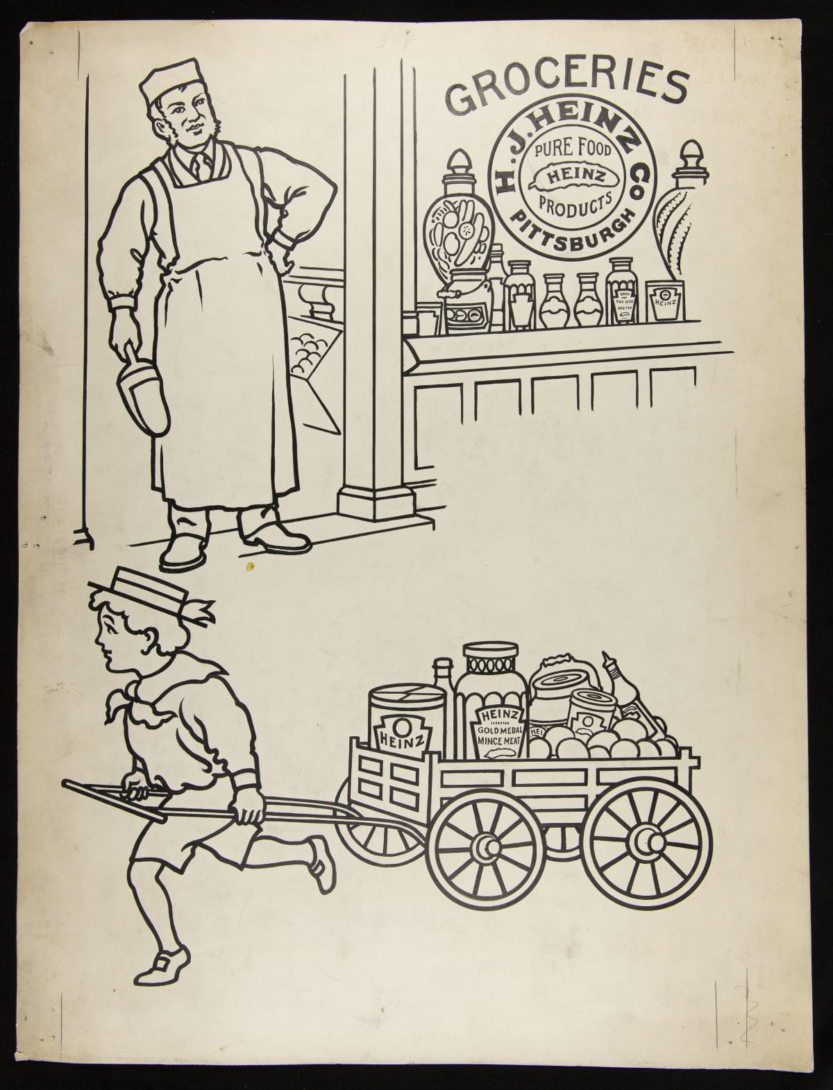 The H.J. Heinz Company employed ambitious and comprehensive advertising strategies to meet consumers at home, in stores, and everywhere in between. From trade cards and posters to newspaper and magazine ads, Heinz created thousands of advertising layouts and illustrations for various publications. This drawing might have been used in a children's coloring book.