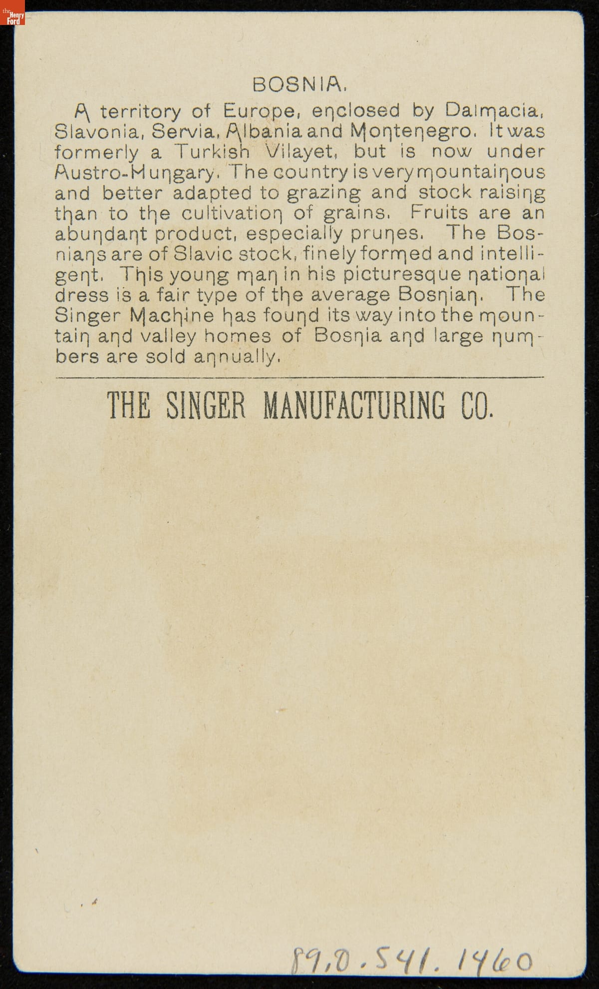 As color printing gained momentum in the late 19th century, trade cards became a major means of advertising goods and services. Americans enjoyed and often saved the vibrant little advertisements found in product packages or distributed by local merchants. The Singer Sewing Machine Company had a series of trade cards, like this one, offering images of Singer machine users from around the world in their national dress.
