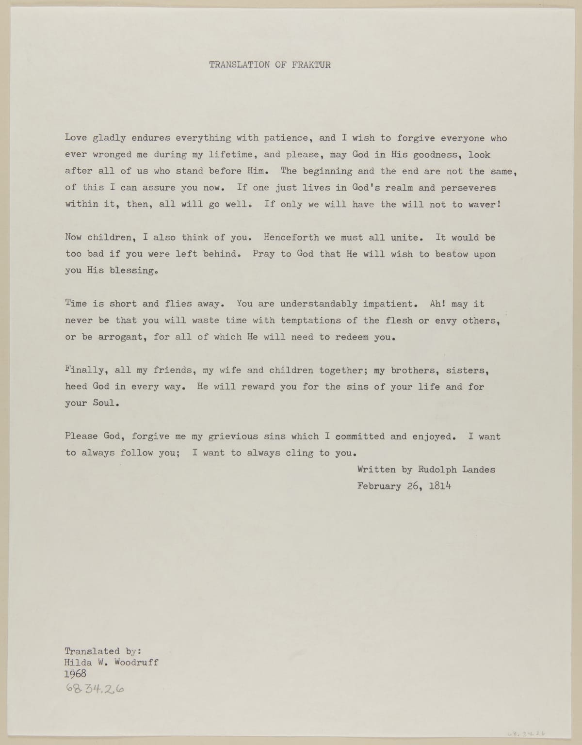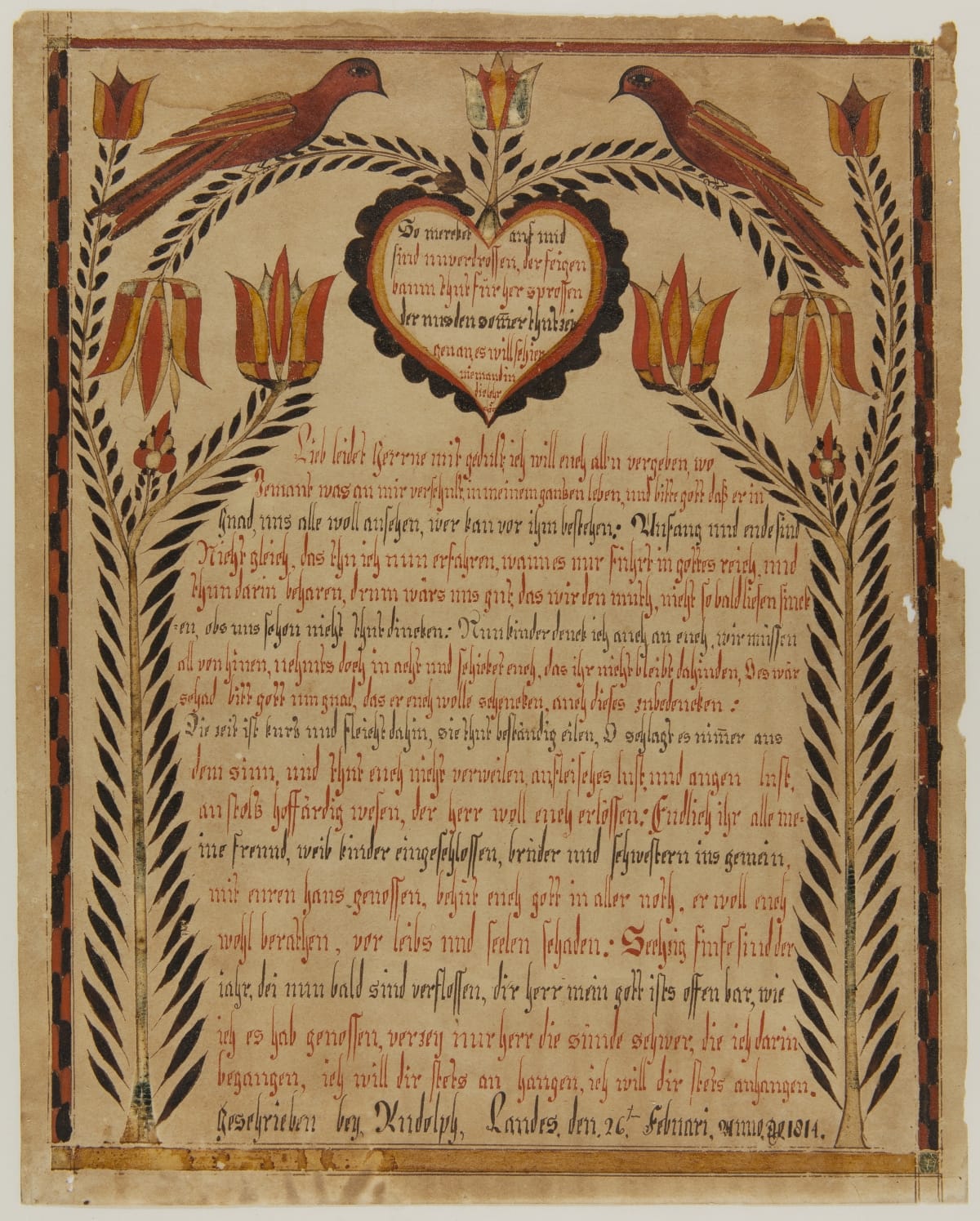 Early German immigrants created decorative documents, known as Fraktur, for a variety of reasons. Many commemorated a child's birth and baptism. Others were made as keepsakes, symbols of achievement or expressions of the immigrant's heritage or religion. These documents usually incorporated intricate lettering, elaborate borders and colorful drawings. In 1814, Rudolph Landes penned this religious letter and embellished it with stylized birds, flowers and a checkered border.