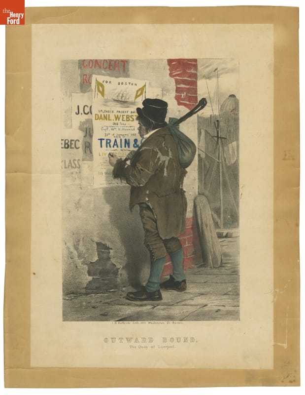 This poster, created by John Henry Bufford's lithography firm in Boston, shows an English man wearing a tattered coat and knapsack looking at a poster announcing the departure of a ship to Boston, Massachusetts. In the nineteenth century, it was common for people to contemplate the idea of emigration to America for the perceived, "better opportunities."
