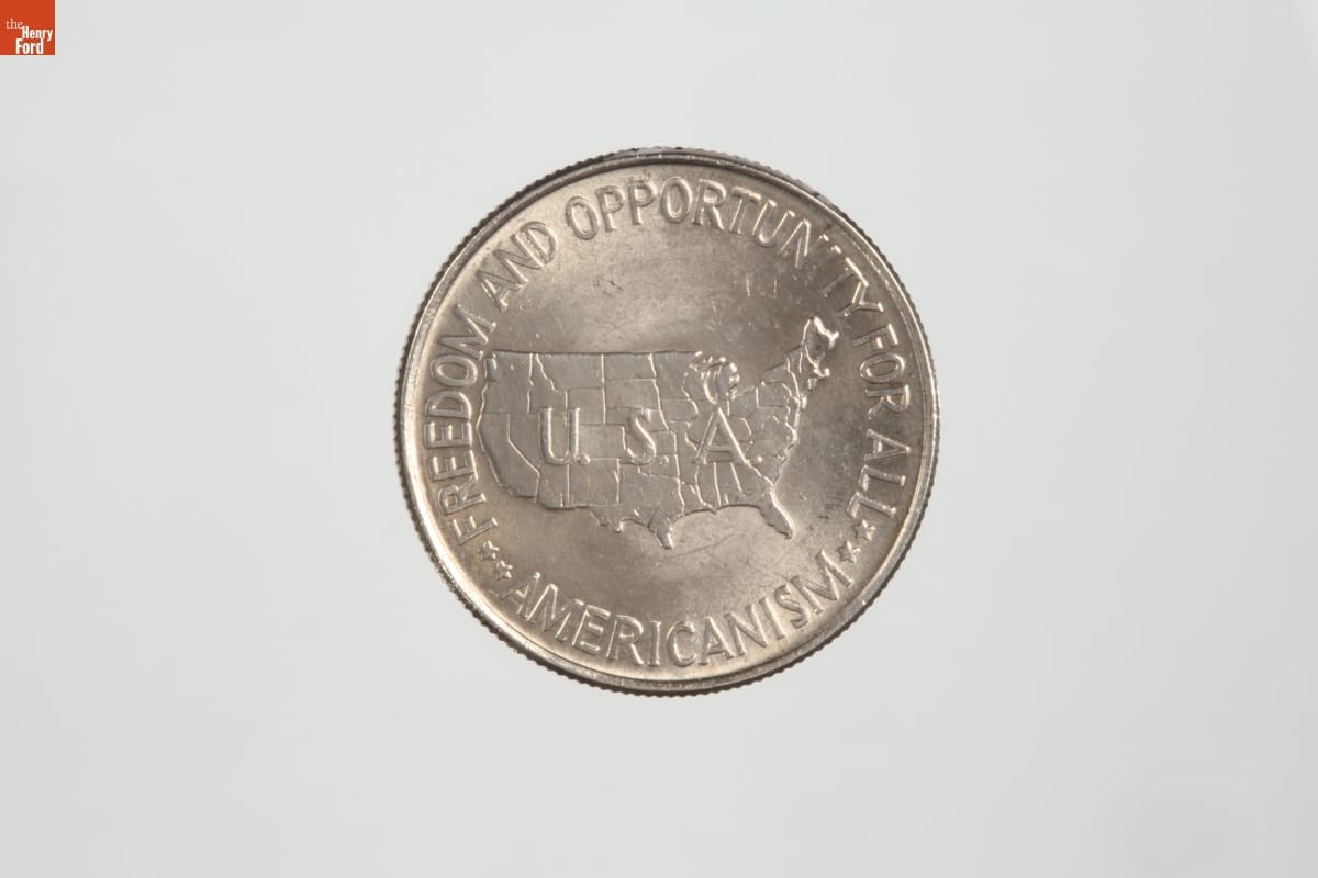 The second U.S. coin commemorating African Americans featured two Tuskegee Institute educators, president Booker T. Washington (1856-1915), and agricultural scientist, George W. Carver (early 1860s-1943). The U.S. Mint commissioned African-American sculptor and artist Isaac Scott Hathaway to design the coin. Issued from 1951 to 1954, the inscription on the back emphasized patriotism and individual liberty amid growing Cold War tensions.