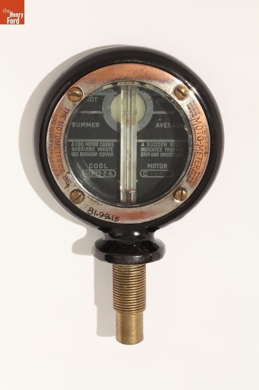 Automobiles often came without temperature gauges before the early 1930s, so enterprising manufacturers sold aftermarket motometers. Mounted on a car's radiator, these devices measured and displayed coolant water vapor temperature, notifying drivers if their automobiles were in danger of overheating. Moto-Meter Co. Inc. dominated the American market, producing the popular Boyce motometer and others featuring an automotive manufacturer's name or logo.