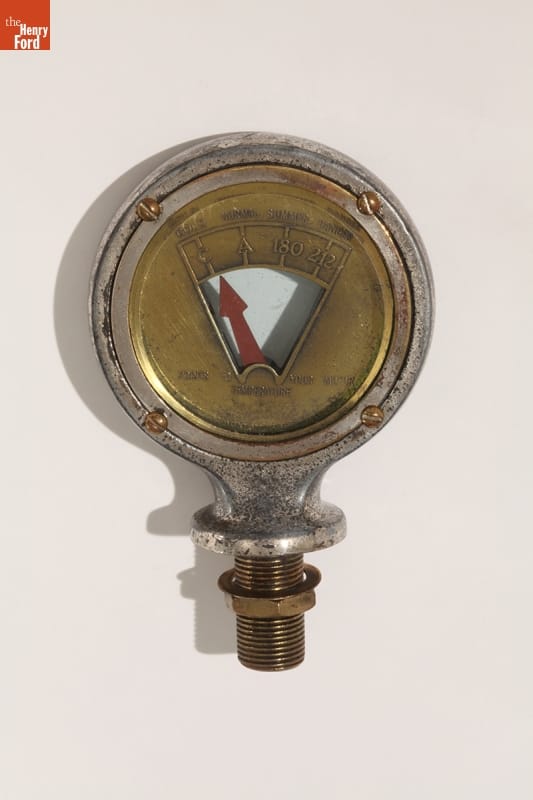 Automobiles often came without temperature gauges before the early 1930s, so enterprising manufacturers sold aftermarket motometers. Mounted on a car's radiator, these devices measured and displayed coolant water vapor temperature, notifying drivers if their automobiles were in danger of overheating. Bushnell Manufacturing Company produced this "Arro-Meter" motometer in Berkeley, California, around 1925.