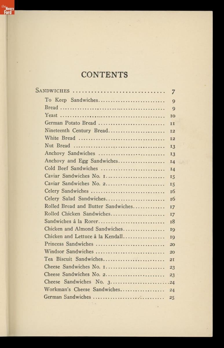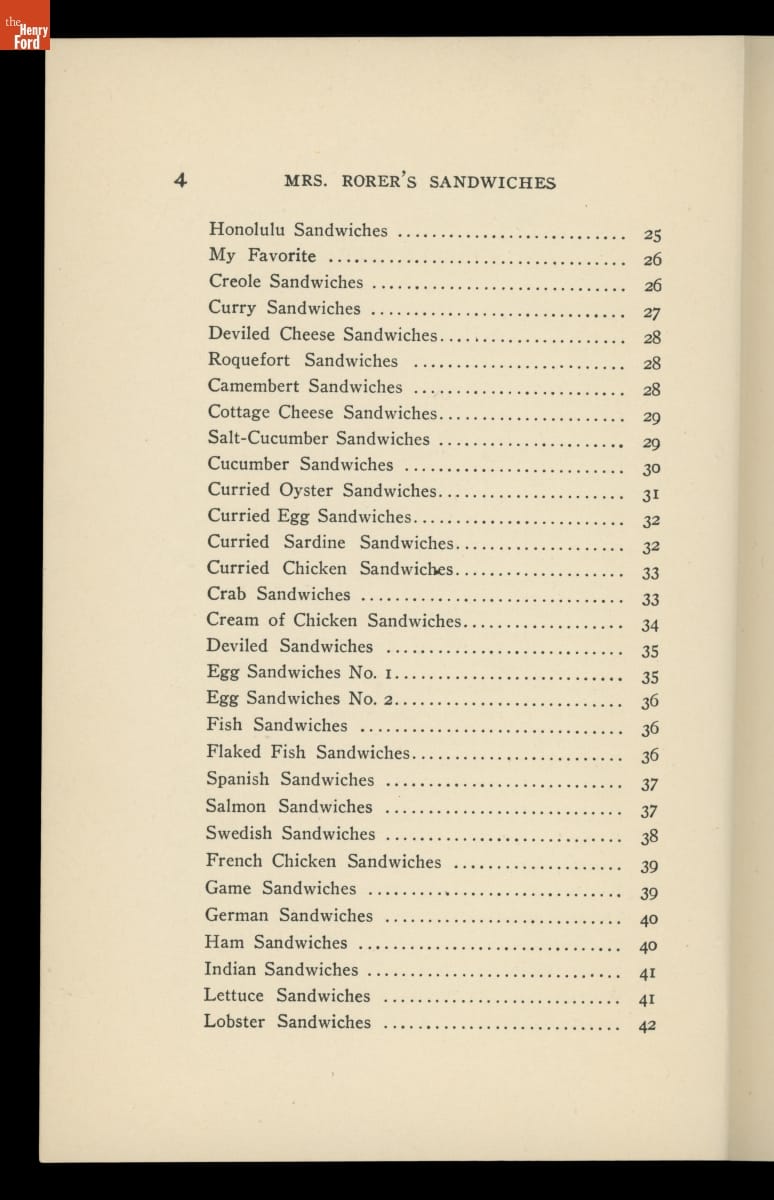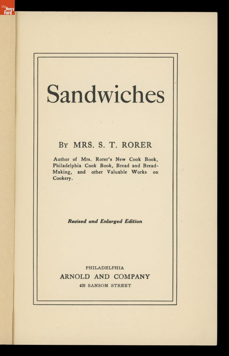 By the late 1800s, sandwiches had found their place in American lunchboxes and on dinner tables. This cookbook, originally published in 1894 by well-known cookbook author Sarah Tyson Rorer, was the first American cookbook focused solely on sandwiches.
