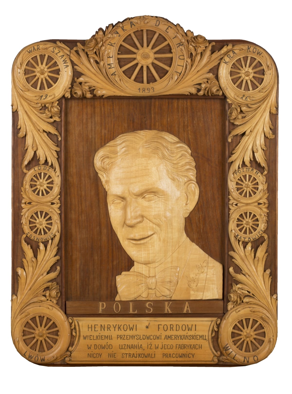 Acknowledging Henry Ford's innovative spirit, individuals employing their own original and imaginative efforts bestowed hundreds of handmade gifts upon him. The translated inscription of this piece -- "to the great American industrialist in recognition and proof of manufacturing wherein works do not strike" -- reflects the opinion of the Polish artist regarding the industrial instability in Poland of that time.