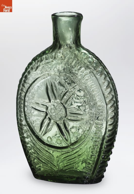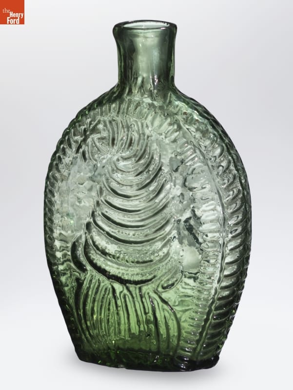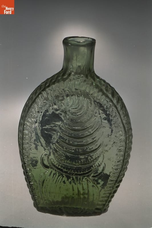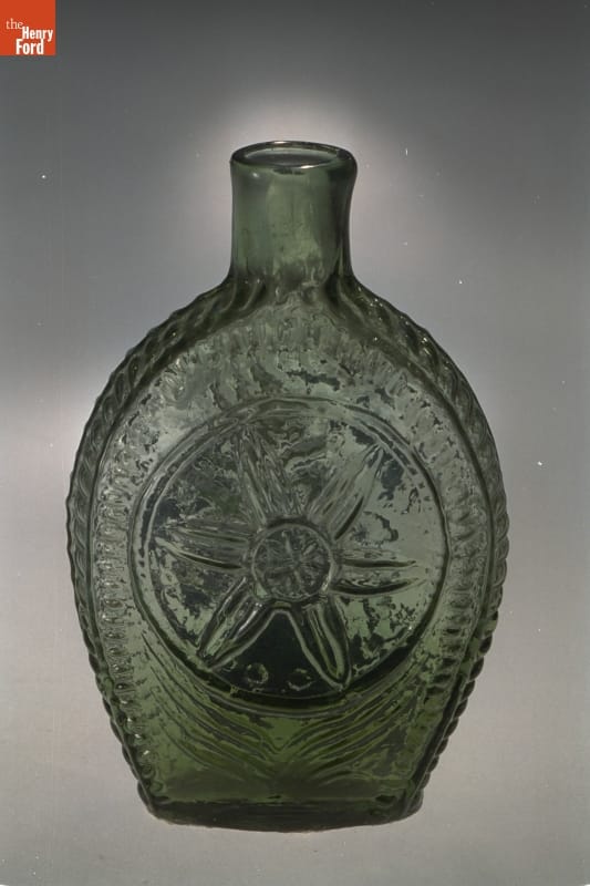 Glass factories in America began producing inexpensive, mold-formed flasks in the early 1800s. These figured flasks, often decorated with symbols of national pride or political or cultural affiliation, appealed to America's common man. The inverted cornucopia found on the front of this flask alludes to America's bounty. The other side has a decorative star-shape design.