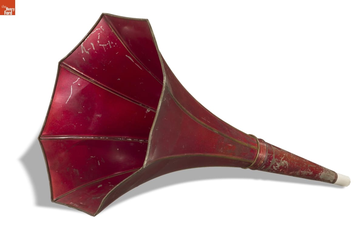 This maroon polygonal phonograph horn accompanied the Edison Fireside Model A phonograph. This combination type phonograph was introduced in 1909 as an affordable alternative to the Edison Standard model. Its Model K reproducer could play both two-minute and four-minute cylinder recordings.