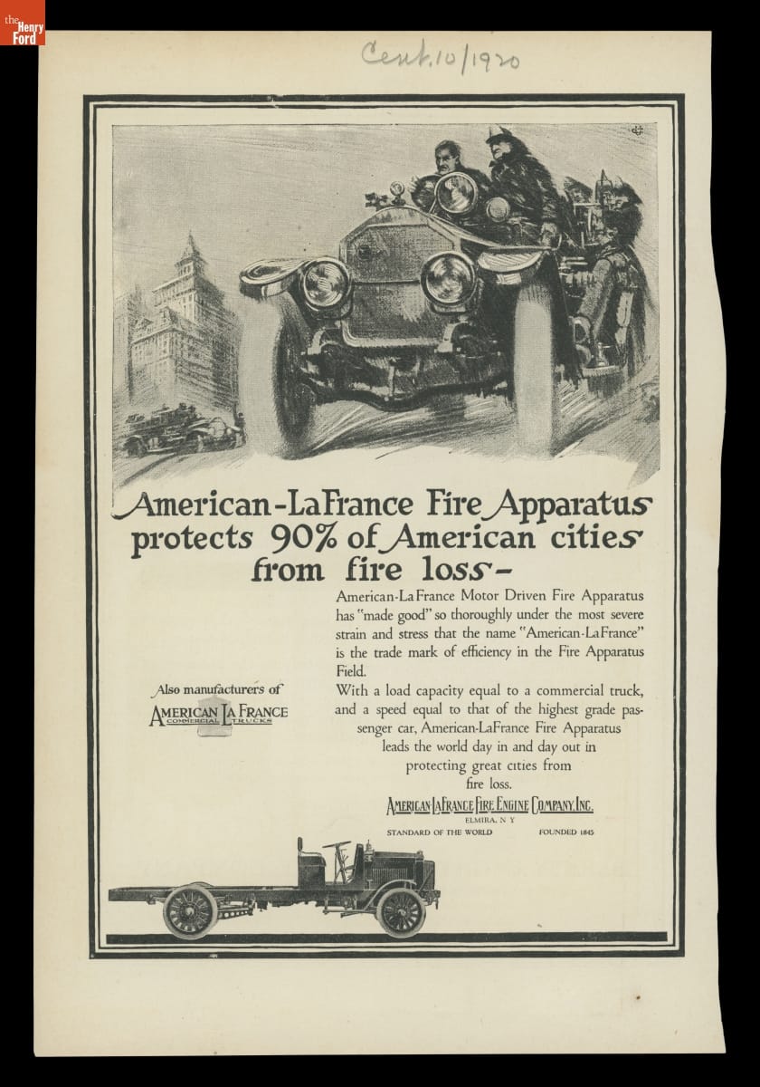 Advertisement, "American-LaFrance Fire Apparatus Protects 90% of American Cities from Fire Loss," October 1920