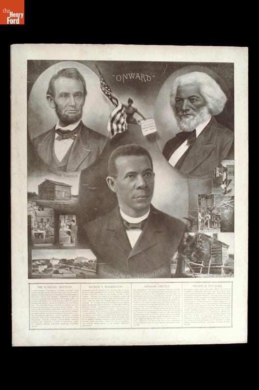This poster depicts three leading Americans who advanced African-American life at the turn of the 20th century. Frederick Douglass challenged slavery and worked for its abolition. President Abraham Lincoln signed the Emancipation Proclamation to preserve the Union by declaring freedom to slaves in rebel states. Booker T. Washington, leader of the Tuskegee Institute, promoted African-American rights through education and industry.