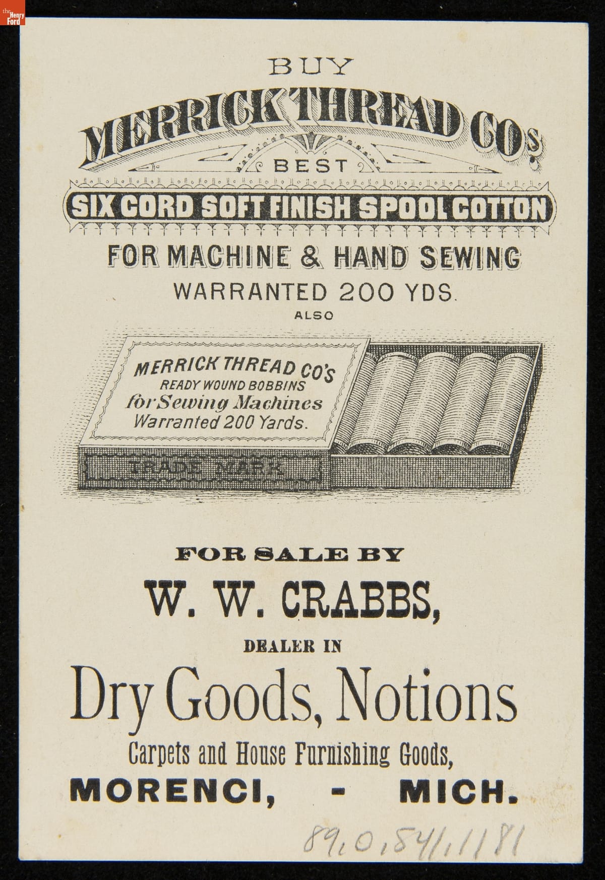 As color printing gained momentum in the late 19th century, trade cards became a major means of advertising goods and services. Americans enjoyed and often saved the little advertisements found in product packages or distributed by local merchants. This trade card advertises Six Cord Soft Finish Spool Cotton by Merrick Thread Company.