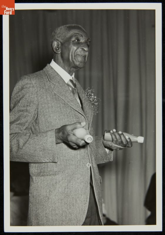 In 1939 George Washington Carver traveled to Albion, Michigan, to visit Floyd E. Starr's Starr Commonwealth for Boys, a school for orphaned, homeless, or "delinquent" young men. In this photograph, taken during Carver's lecture at the Starr Commonwealth, Carver appears to be showing bottles of peanut oil to the audience.