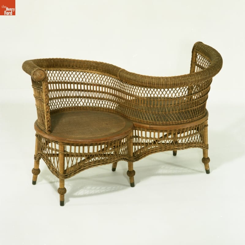 During a time when the rules of propriety were quite strict, this unusual seat physically separated young people of the opposite sex. But it still allowed their heads to come near for private conversation. Hence its name "tete-a-tete," which in French means "head-to-head."