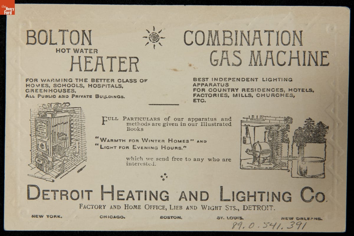 Trade Card for the Bolton Hot Water Heater and Combination Gas Machine, Detroit Heating and Lighting Co., 1870-1890