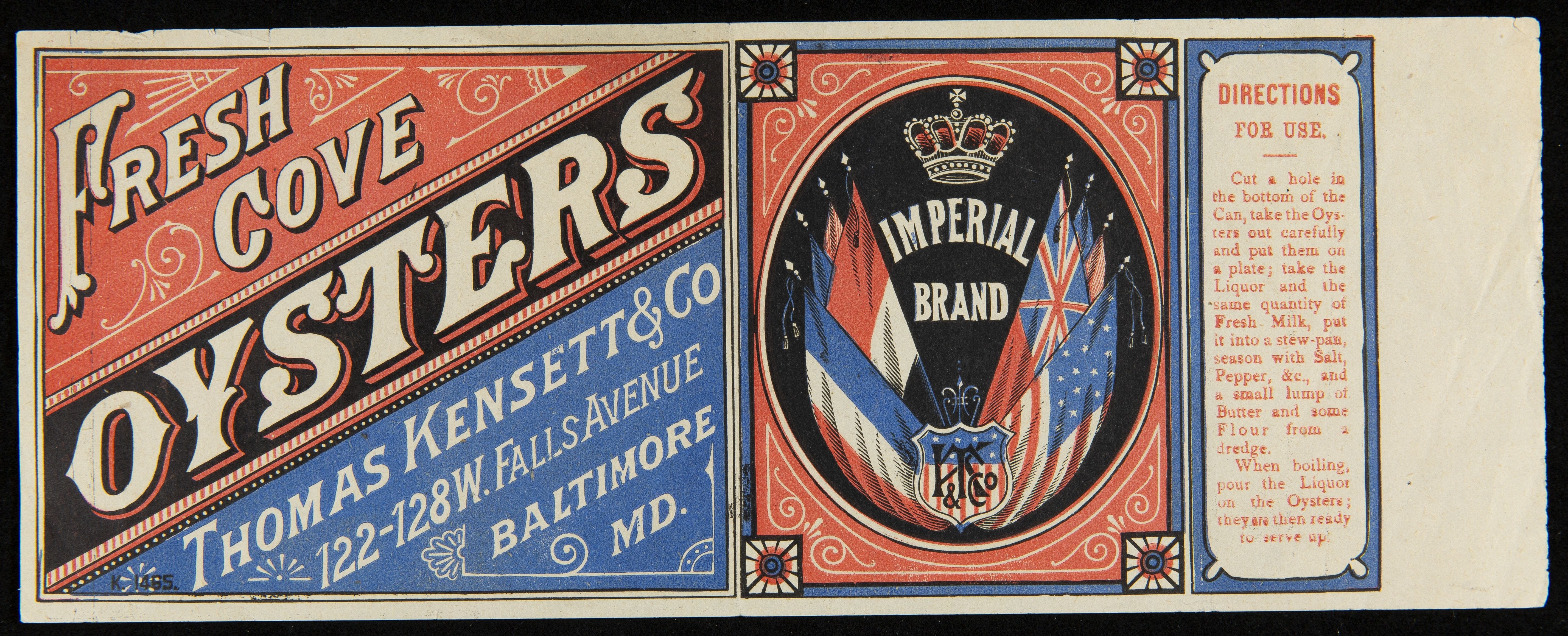 Text on label reads: Fresh Cove OYSTERS \ THOMAS KENSETT & CO \ 122-128 W. FALLS AVENUE \ BALTIMORE \ MD. \ IMPERIAL BRAND \ [TKC shield logo] \ DIRECTIONS FOR USE. Cut a hole in the bottom of the Can, take the Oysters out carefully and put them on a plate.; take the Liquor and the same quantity of Fresh Milk, put it into a stew-pan, season with Salt, Pepper, &c., and a small lump of Butter and some Flour from a dredge. When boiling, pour the Liquor on the Oysters; they are then ready to serve up