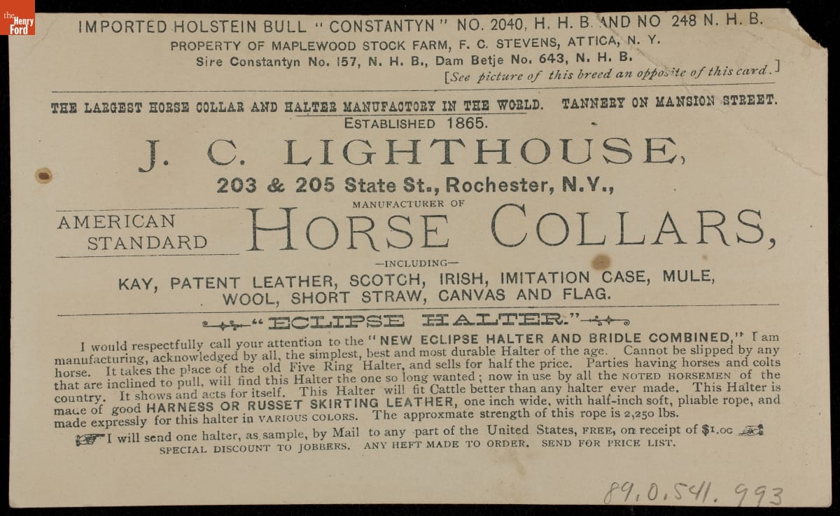 Trade Card for Horse Collars and "Eclipse" Halters, J. C. Lighthouse, 1884-1894