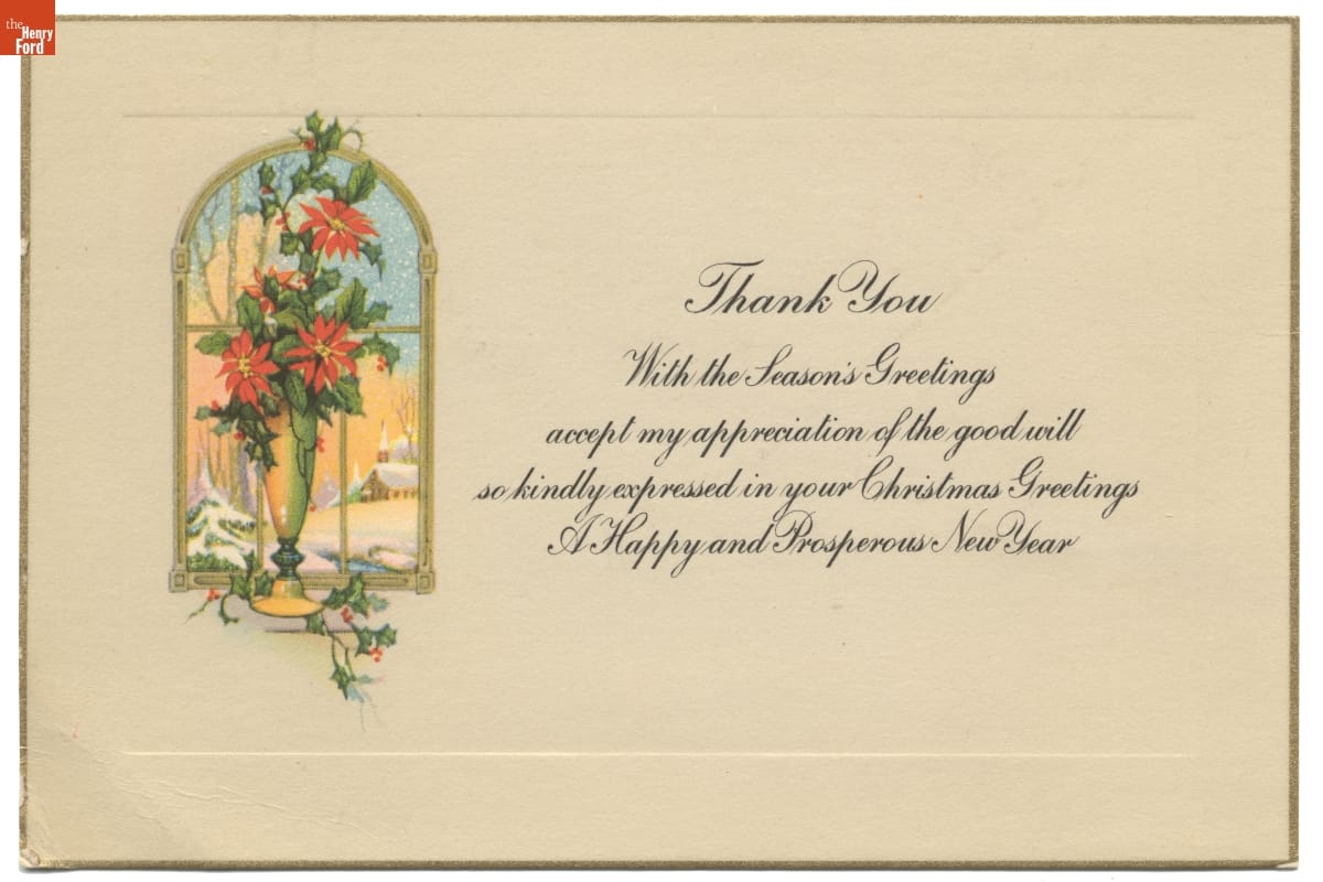 Mailing colorful, commercially designed greeting cards had become an American tradition by the 1920s. During the holidays, friends and neighbors commonly exchanged cards wishing one another a Merry Christmas or Happy New Year. This appreciative card could be sent in response to a holiday greeting.