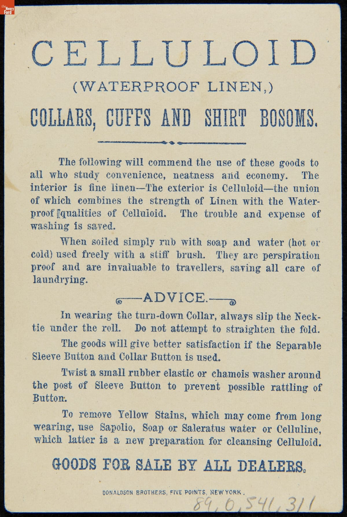 As color printing gained momentum in the late 19th century, trade cards became a major means of advertising goods and services. Americans enjoyed and often saved the little advertisements found in product packages or distributed by local merchants. This trade card advertises Celluloid Waterproof Collars, Cuffs & Shirt Bosoms.