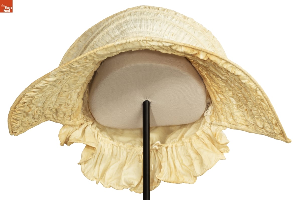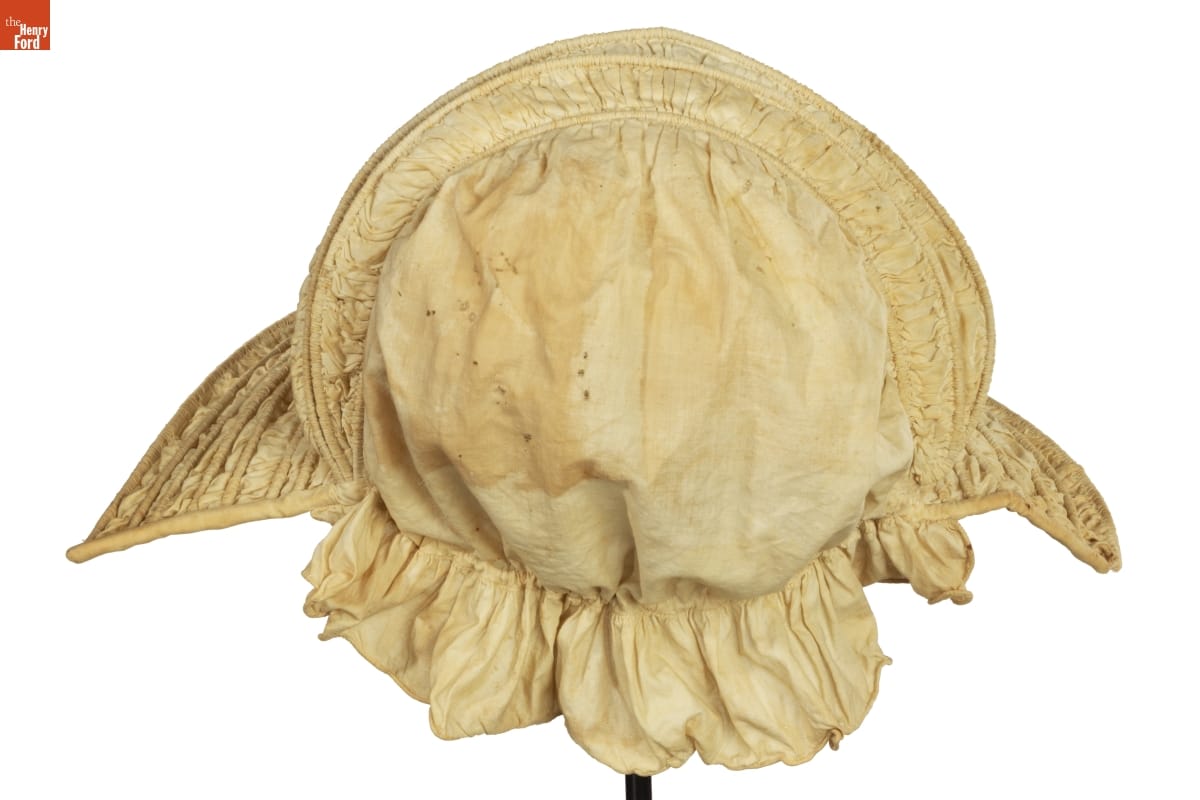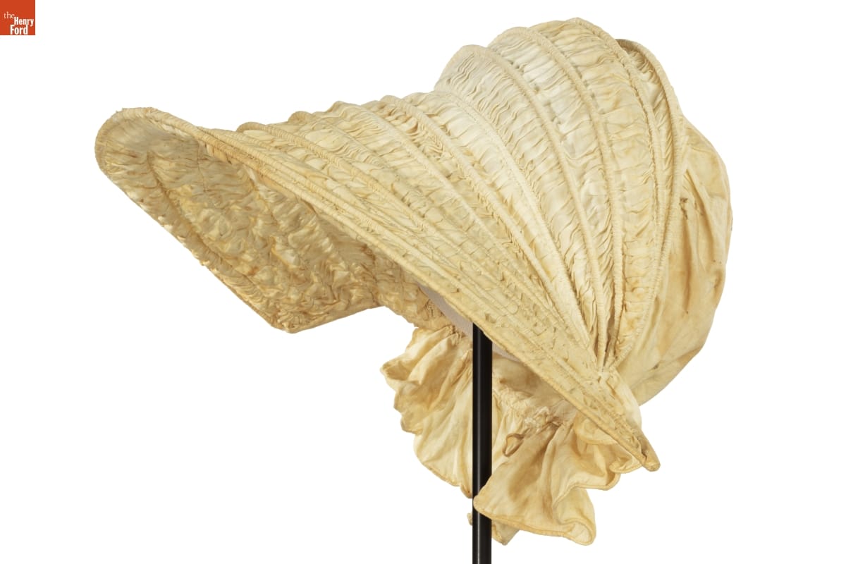 Collapsible calash bonnets returned to fashion in the 1820s and 1830s. They had been popular during the late 1700s in a balloon-shaped form to protect elaborate hair styles from being crushed. In the 1830s they followed current fashion, a small crown at the back of the head and an open brim. The ruffle at the back, called a bavolet, shaded the neck.