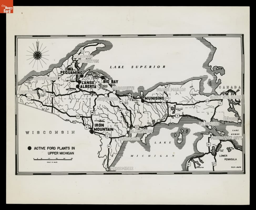 Map, "Active Ford Plants in Upper Michigan," January 1945