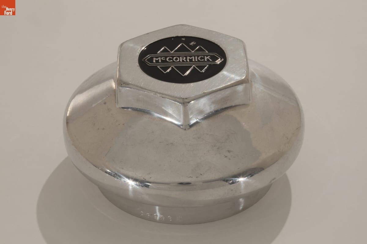 Like automobiles, early tractors had wheels with a central hub and greased wheel bearing. Hub caps kept grease in and dust out. Beginning in 1915, the Aluminum Goods Manufacturing Company of Manitowoc, Wisconsin, supplied hubcaps to manufacturers. This one was made for the International Harvester Company, producer of McCormick tractors.