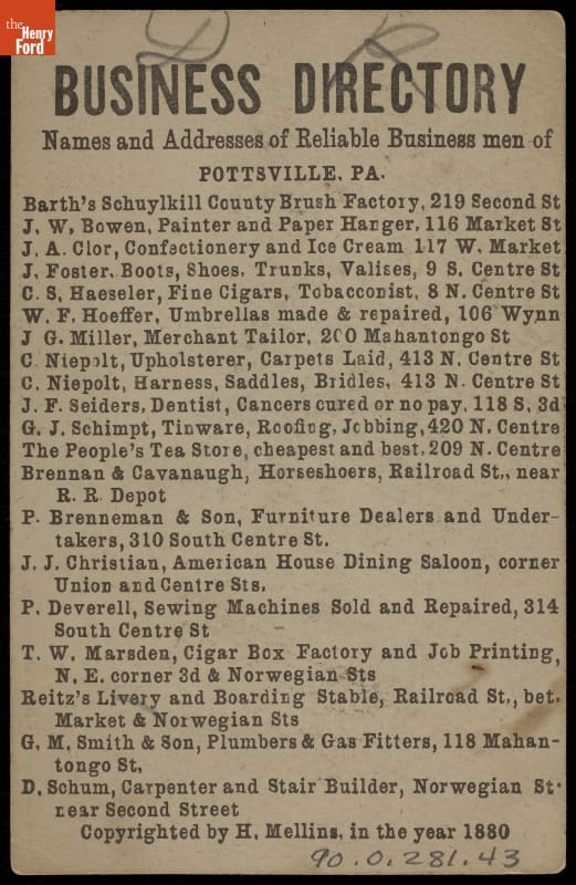 Advertised service by Persse Deverell, Pottsville, Pennsylvania. Card lithographed by Phoenix Card Company, New York, New York.