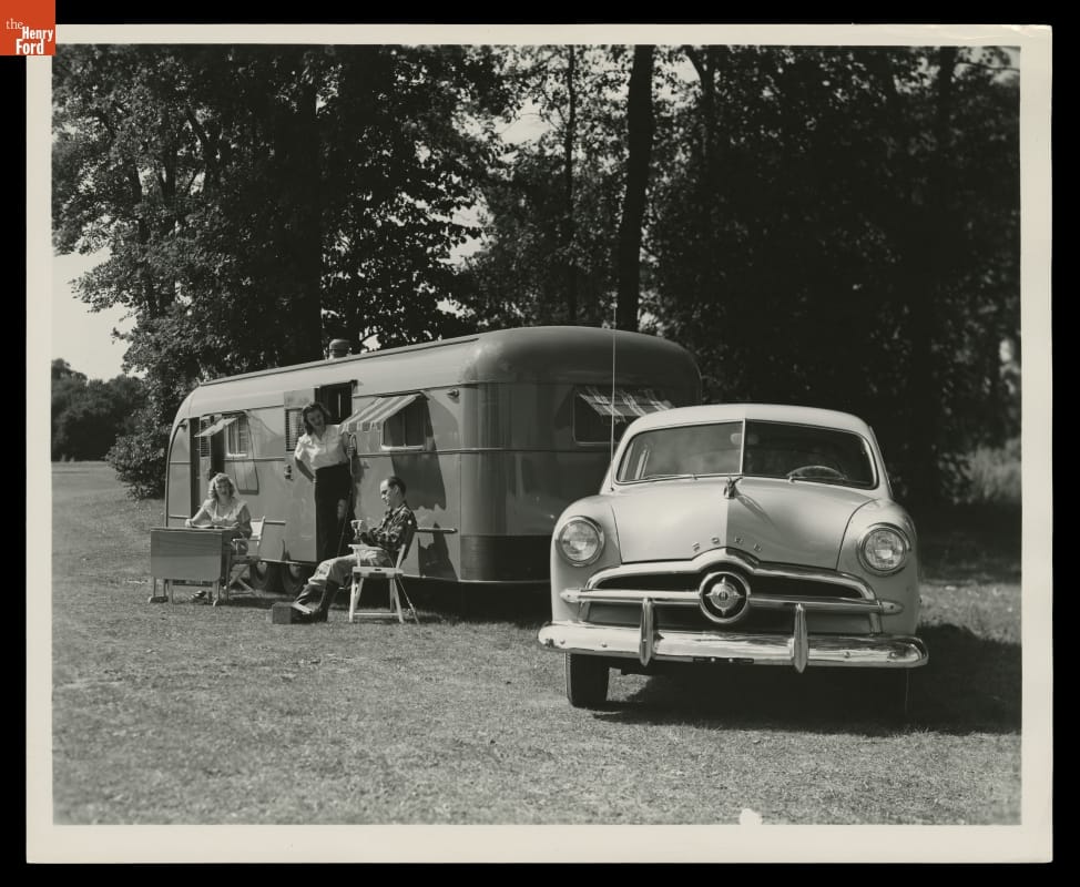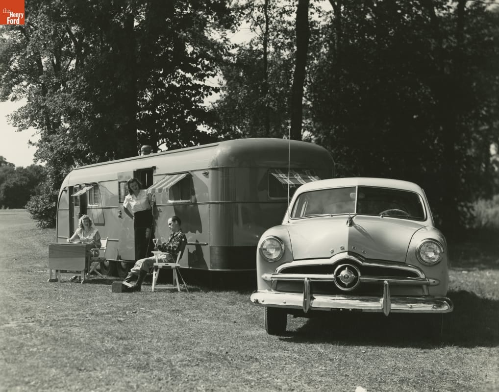 The 1949 Ford and a Vagabond trailer are featured in this Ford Motor Company publicity photograph. Though the 1949 Ford came with a new sleek look, it still relied on the pre-war V-8 engine design for power -- enough to tow a vacation trailer.