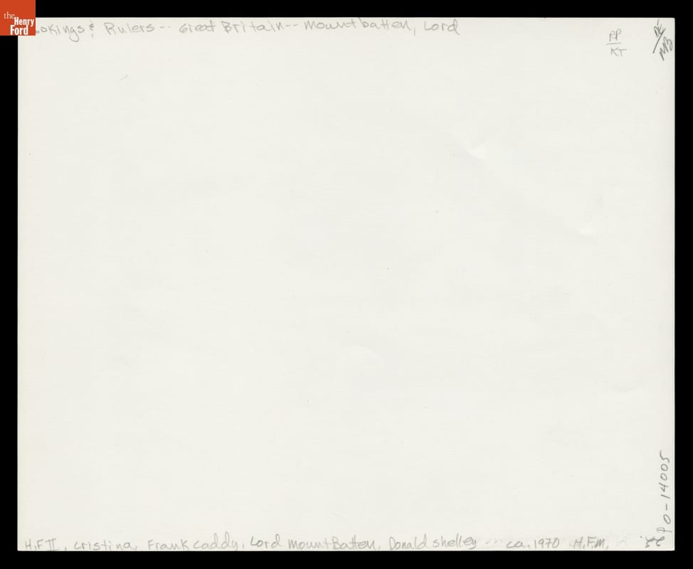 Lord Mountbatten was great-grandson of Queen Victoria, a British World War II hero and viceroy of India in 1947 during that country's partitioning and independence. In April 1972, he toured Henry Ford Museum and Greenfield Village, accompanied by Henry Ford II and Edison Institute's president, Donald Shelley. Here, the group stops at the museum's cornerstone to examine the signature of Thomas Edison.