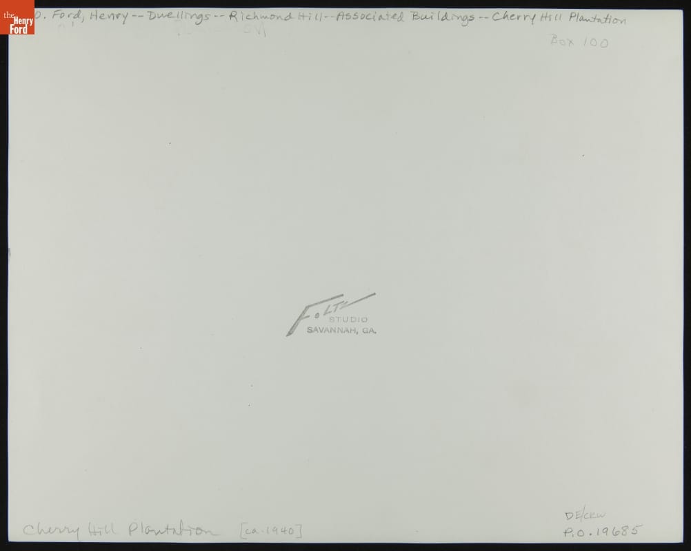The Cherry Hill plantation house, located in present-day Bryan County, Georgia, was built in 1874 after the original building was burned during the Civil War. In the mid-1920s, Henry Ford began purchasing vast amounts of land in the area; he acquired Cherry Hill in 1925. Henry and Clara stayed in this house before the completion of their nearby winter residence, Richmond Hill.